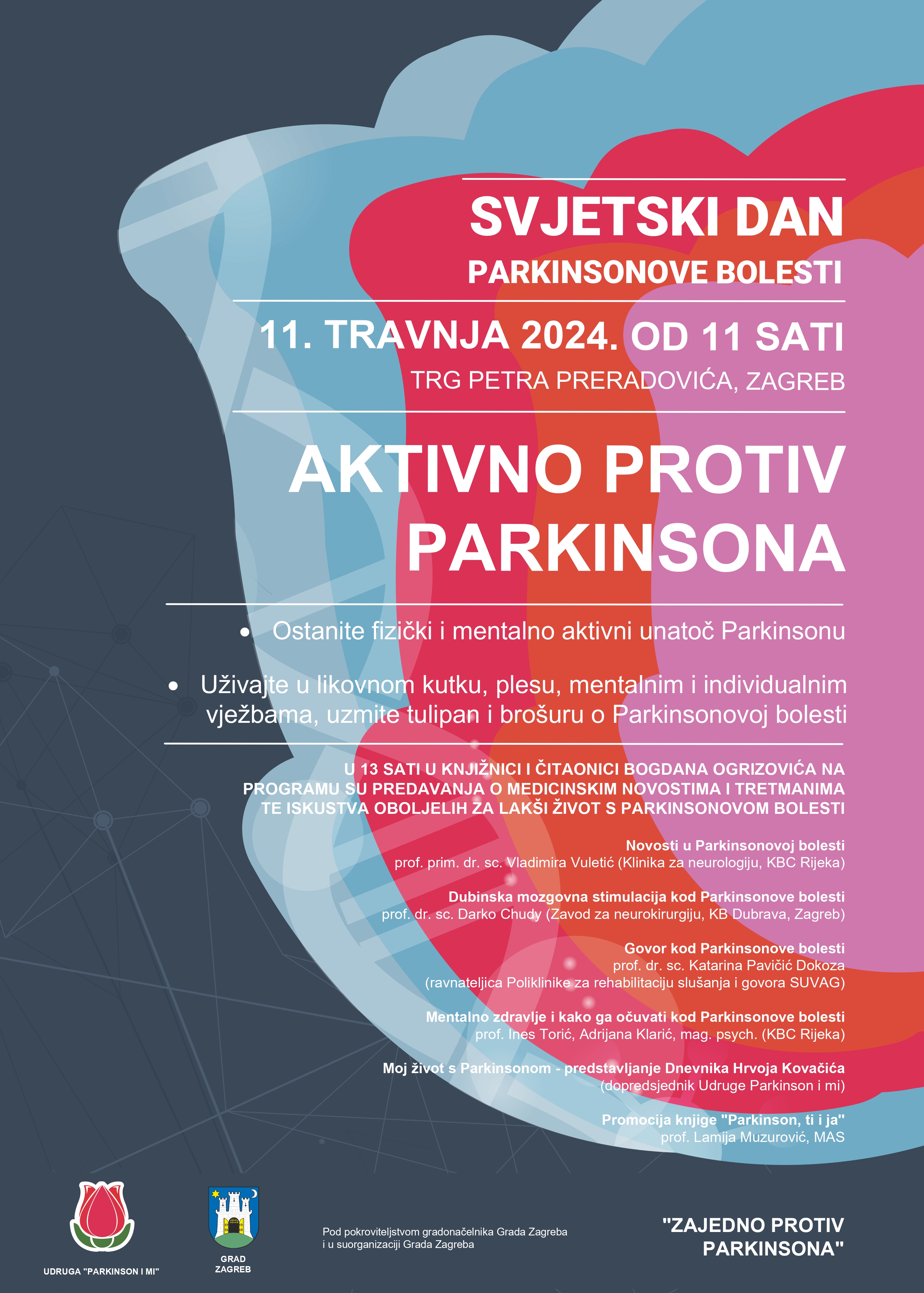 Obilježavanje Dana Parkinsonove bolesti održat će se 11. travnja 2024. godine, od 11.00 do 13.00 sati na Trgu Petra Preradovića. Kao i do sada, našu manifestaciju započet ćemo štandom na Cvjetnom trgu gdje će predstavnici naše Udruge dijeliti zainteresiranim građanima informativne i promotivne materijale te crvene tulipane kao simbole borbe protiv Parkinsonove bolesti. Istovremeno ćemo zahvaljujući zagrebačkoj Likovnoj akademiji održati art radionicu i likovni kutak. Uz to, psihologice će kroz mentalni kutak raditi na mentalnom osnaživanju oboljelih, dok ćemo uz pomoć plesa i individualnim vježbama educiranog fizioterapeuta potaknuti na fizičku aktivnost.
